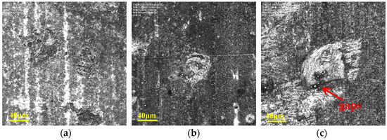 The worn surface morphology of Al-Si alloy cylinder liner samples after mechanical grinding is shown in Figure 8. When the exposure height of silicon particle was lower, aluminum was easily rolled repeatedly to cover the silicon particle during the friction process (Figure 8a). When the exposure height of the silicon particle was suitable, the massive silicon particle was visible on the worn mechanical grinding surface (Figure 8b). When the exposure height of the silicon particle was higher, the silicon particle easily fell off during the friction process, and some pits appeared on the worn surface (Figure 8c).
