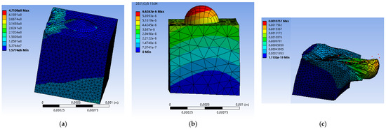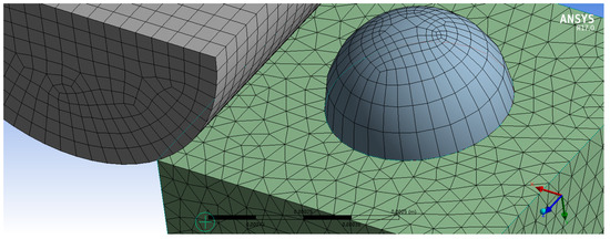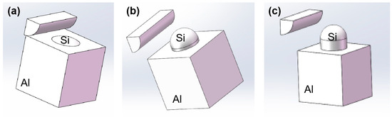 The edges of the exposed silicon particles were circular. For the convenience of calculation, the protruding parts of the silicon particles were approximately idealized as circular. The exposed height of the silicon particles in the model was between 0.5 and 3 microns. These data were set based on the previous experimental results. The contact stress on the friction process of the silicon particle was analyzed by means of ANSYS/Explicit Dynamics with the three-dimensional dynamic finite element model, as shown in Figure 10. The exposure height of the silicon particle is lower in Figure 10a, suitable in Figure 10b, and higher is Figure 10c. The material property parameters are shown in Table 1. The model is meshed in Figure 11.