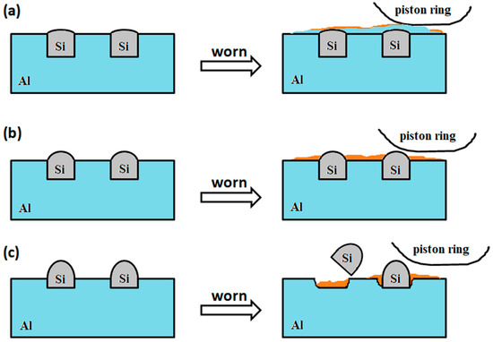 Figure 14 presents a schematic illustration of the wear mechanism. When the exposure height of the silicon particles was lower, the aluminum was easily rolled repeatedly to cover the silicon particles during the friction process (Figure 14a). This could cause adhesive wear. The friction coefficient and weight loss would be increased. In contrast, when the exposure height of the silicon particles was suitable, the Al-Si alloy cylinder liner sample owned the lowest friction coefficient and weight loss. Aluminum would not easily cover the silicon particle, and the area between two protruding silicon particles could increase the oil storage space and improve the lubrication (Figure 14b). The silicon particles with round edges were not easily broken off during the friction process. That led to an excellent tribological property. Whether the sample was presented by mechanical grinding or laser finishing, the suitable exposure height of the silicon particle was 1.2 μm. As shown in Figure 14c, when the exposure height of the silicon particles was higher, it did not combine well with the aluminum matrix. The silicon particles easily fell off during the friction process. This would increase the probability of abrasive wear. Even if the silicon particles did not fall off, there would be some cracks between them and the matrix. By either mechanical grinding or laser finishing, when the exposure height of the silicon particles was higher, the friction coefficient and weight loss were increased. The exposure height of the silicon particles was important to the tribological property of the Al-Si alloy cylinder liner [17]. As a result, a suitable height reduced the probability of adhesion wear and abrasive wear and increased the lubrication. It presented an excellent tribological property.