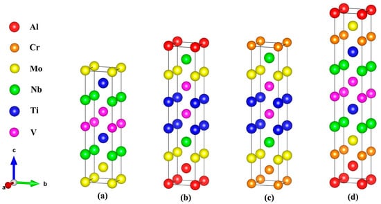 SQS supercell model of RHEAs before structural relaxation. (a) RHEA−1 1 × 1 × 4; (b) RHEA−2 1 × 1 × 5; (c) RHEA−3 1 × 1 × 5; (d) RHEA−4 1 × 1 × 6.