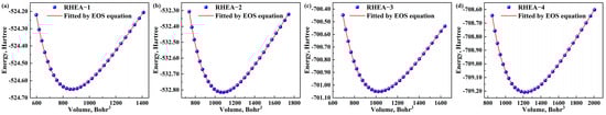 The relationship between energy and volume of RHEAs: (a) RHEA−1; (b) RHEA−2; (c) RHEA−3; (d) RHEA−4.
