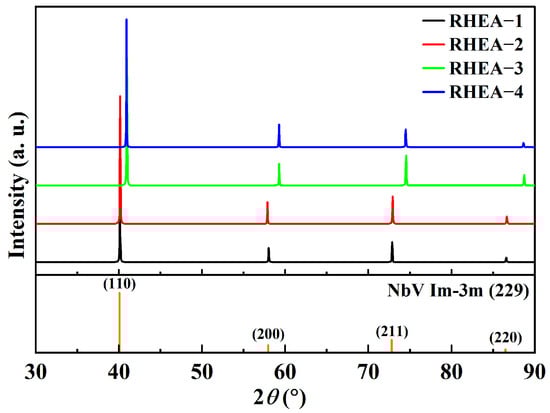 From the angle change of the theoretical XRD curve peak in Figure 3, it is found that the difference between RHEA-1, RHEA-2 alloys, and the NbV phase (PDF card data) [50] is relatively small. In contrast, the difference between RHEA-3 and RHEA-4 alloys is more significant. The diffraction peak 2θ angle difference corresponding to the crystal plane (220) in the RHEA-3 structure is the largest, reaching 2.258°, and the most negligible angle difference is the diffraction peak of the crystal plane (110) in the RHEA-1 structure, only 0.025°. The lattice constants and interplanar spacing of the four RHEAs are all smaller than the standard BCC NbV phase [50], and the order of magnitude of this change is RHEA-3 > RHEA-4 > RHEA-2 > RHEA-1. That is to say, the lattice constants of RHEA-2, RHEA-3, and RHEA-4 decrease relative to RHEA-1 while the interplanar spacing increases. The main reason for the difference in the calculated XRD data of the four RHEAs shown in Figure 3 is due to the distortion of the alloy structure caused by the addition of Al/Cr. The atomic radii of Al, Cr, and AlCr are rRHEA-2 = 1.432 Å, rRHEA-3 = 1.249 Å, and rRHEA-4 = 1.341 Å, respectively (where rRHEA-4 = (rRHEA-2 + rRHEA-3)/2). Compared with the theoretical atomic radius rRHEA-1 of RHEA-1 (rRHEA-1 = 1.393 Å), the |Δr| value is 0.040 Å, 0.144 Å, and 0.052 Å, respectively. The degree of distortion relative to the RHEA-1 structure is RHEA-3 > RHEA-4 > RHEA-2.