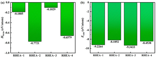 The enthalpy of formation and binding energy are commonly used to characterize the thermodynamic stability of alloy systems. The enthalpy of formation (or heat of formation) refers to the energy released by the system when atoms form compounds from a single substance (or substance) state, which can be used to characterize the difficulty of compound formation. When the value of heat formation is negative, and the absolute value of its value is more significant, it indicates that the substance is more likely to form [45]. The calculation formula for the enthalpy Hform (in eV/atom) of single-phase solid solution alloy formation is as Equation (S9) [45]. When calculating the energy of the elemental M structure, the same parameter settings as RHEA cell structure optimization are used. Figure 4a shows the enthalpy of formation Hform bar charts for four types of RHEA supercell structures with equal molar ratios. Figure 4a shows that the Hform of the four alloys are all negative, indicating that they are thermodynamically stable structures. However, with the addition of the Al element, the Hform of RHEA−2 (RHEA−4) is more negative than RHEA−1 (RHEA−3), indicating that they are more likely to form thermodynamically stable structures.