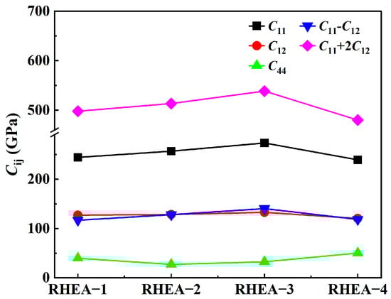 The elastic constant matrices of four SQSs were calculated, and the lattice constants a, single crystal C11, C12, and C44 of the cubic structure were obtained by referring to the averaging scheme proposed by Gao et al. [46]. Based on this, the elastic stiffness, elastic constant Cij, bulk modulus B, shear modulus S, Young’s modulus Y, and Poisson’s ratio v values were calculated, as shown in Table 4. The variation of Cij values for the four RHEAs is shown in Figure 5. From Figure 5, it can be seen that their Cij satisfies the Born Huang mechanical stability principle: C11, − C12 > 0, C11 + 2C12 > 0, C44 > 0, indicating that the SQSs of these four alloys are mechanically stable. The order of the ability of the four RHEA structures to resist axial strain (C11) is RHEA−3 > RHEA−2 > RHEA−1 > RHEA−4. The order of the ability to resist shear deformation (C44) is RHEA−4 > RHEA−1 > RHEA−3 > RHEA−2. C12 represents the modulus that resists shear deformation along the [110] crystal direction on the (110) crystal plane, and their order of magnitude is RHEA−3 > RHEA−2 > RHEA−1 > RHEA−4.