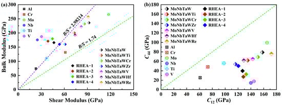 The distribution of B/S values of RHEAs. (a,b) The relative magnitudes of their elastic stiffness parameters C12 and C44.