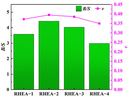The Poisson’s ratio v represents the relative values of solid compression (or tension) deformation and shear deformation. When the v of a material is more significant than 0.26, the material exhibits toughness, and the magnitude of toughness is positively correlated with the v [52]. The v of RHEAs in Table 4 are all greater than 0.26, indicating that their toughness is good. Figure 7 shows the B/S ratios of four RHEAs and their corresponding v. It can be found that there is a positive correlation between v and the B/S ratio. After simplifying the calculation equation describing the v in Equation (S1), the new Equation (9) can be obtained. From Equation (9), it can be seen that the v is positively correlated with the B/S ratio. These are consistent with the trend of change in Figure 7.