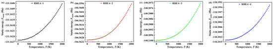 The static energy value curves of four RHEAs cubic structures obtained based on the QHA model [49] in the temperature range of 0–2000 K are shown in Figure 8. Figure 8a–d shows that the static energy values of the four RHEA cubic structures gradually increase with increasing temperature. These may be due to the increase in temperature, which increases the internal energy of atoms in the RHEA cubic structure (mainly the kinetic energy of atoms), thereby increasing the energy of the entire RHEA cubic structure system.