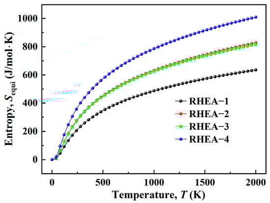 Figure 9 shows the entropy curves of four RHEAs at different temperatures. The entropy values of these four RHEAs show a positive correlation trend with the increase in temperature; that is, as the system temperature increases, the degree of chaos gradually increases.