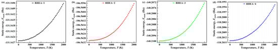 The static energy (Estatic) of RHEAs in the temperature range of 0~2000 K: (a) RHEA−1; (b) RHEA−2; (c) RHEA−3; (d) RHEA−4.