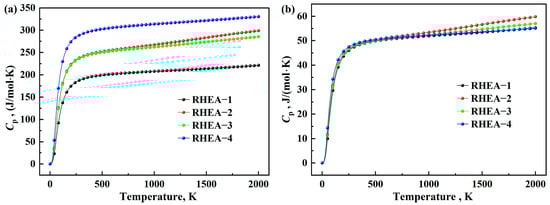 Figure 12 shows the point line graph of the constant pressure heat capacity of four RHEAs as a function of temperature. Figure 12a shows the variation of Cp with temperature in the temperature range of 0–2000 K for the SQSs of the four RHEAs; Figure 12b shows the temperature variation of Cp in the cubic structure obtained by averaging the optimized SQS [47] in the temperature range of 0–2000 K. The difference in heat capacity values among these four RHEAs is significant (as shown in Figure 11 and Figure 12), and the underlying reason is mainly attributed to their structural differences. According to the equipartition of energy theorem [56], diatomic molecules can have twice the kinetic energy of monatomic matter at the same temperature. In other words, the specific heat per mole of diatomic molecular matter is twice that of monatomic matter. Therefore, more complex molecules have higher molar specific heat. Due to the atomic ratio of the SQSs of the four RHEAs being 8:10:10:12, there is an approximate ratio difference in their Cv and Cp specific heats, as shown in Figure 11a and Figure 12a. The number of atoms in the equivalent cubic structure is 2, so the particular Cv and Cp heat values tend to be consistent (or have minor differences), as shown in Figure 11b and Figure 12b.