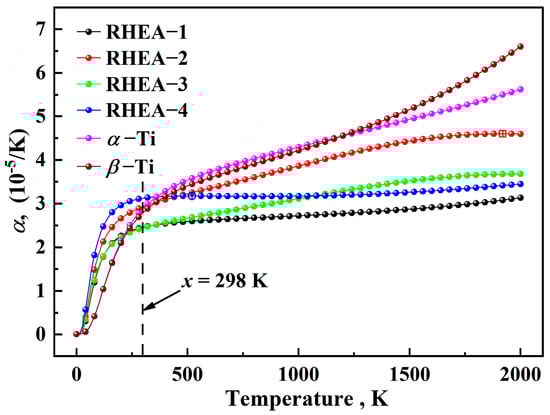 Point line diagram of the αv for RHEAs and α-Ti, β-Ti in the temperature range of 0~2000 K.