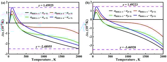 The curves of the αv of the four RHEAs and the difference between α-Ti and β-Ti in the temperature range of 0~2000 K: (a) αv(RHEAs) − αv(α-Ti); (b) αv(RHEAs) − αv(β-Ti).
