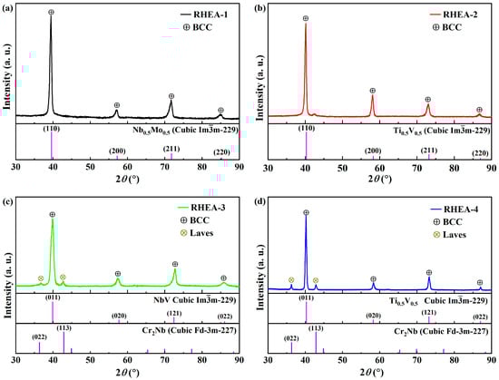 The XRD curves of the four RHEA coatings are shown in Figure 15. Figure 15a shows the XRD curves of the RHEA-1 coating, which corresponds well with the standard PDF card of the body-centered cubic structure Nb0.5Mo0.5 (Cubic -229) [58]. It can be inferred that this phase is a typical BCC structure, indicating that the RHEA-1 coating is a single BCC-disordered solid solution structure. Figure 15b shows the XRD curves of the RHEA-2 coating, and it corresponds to the standard PDF card for Ti0.5V0.5 (Cubic -229) [59]. Similarly, it indicates that the RHEA-2 coating also has a single BCC-disordered solid solution structure; Figure 15c shows the XRD curves of the RHEA-3 coating, and it corresponds to the standard PDF card for NbV (Cubic -229) [50] and Cr2Nb (Cubic Fd-3m-227) [60], which correspond to the BCC phase and C15 Laves phase (Cr2Nb type), respectively. This indicates that the RHEA-3 coating is composed of the main phase of BCC structural solid solution and a small amount of C15 Laves phase; Figure 15d shows the XRD curve of the RHEA-4 coating, corresponding to the standard PDF card for Ti0.5V0.5 (Cubic -229) [61] and Cr2Nb (Cubic Fd-3m-227) [60]. Similarly, it indicates that the RHEA-4 coating is composed of the main phase of BCC and a small amount of the C15 Laves phase.