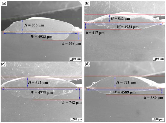 Figure 16 illustrates the scanning electron microscope (SEM) images of the bonding regions between the four types of RHEA coatings and the Ti-6Al-4V substrate. The images demonstrate that the bonding regions of the coatings with the titanium alloy substrate are metallurgically bonded, indicating that the four types of RHEAs have been successfully deposited on the Ti-6Al-4V substrate through laser cladding. This confirms that the expected RHEA coatings were obtained. The width (W, μm), height (H, μm), and substrate depth (h, μm) dimensions of the RHEA coatings can be obtained by adding auxiliary lines to the cross-sectional images of the RHEA coatings and substrate using Microsoft PowerPoint software, in combination with the SEM image scale. Subsequently, the geometric dilution of the coating’s macroscopic morphology can be calculated. The corresponding geometrical dilutions of the coatings are 40.06%, 43.48%, 53.61%, and 35.05%, respectively. These high geometrical dilutions are primarily attributable to the significant concentration differential between Ti in the TC4 substrate and Ti in the RHEAs coatings, as well as the high solubility of Ti in refractory metals.