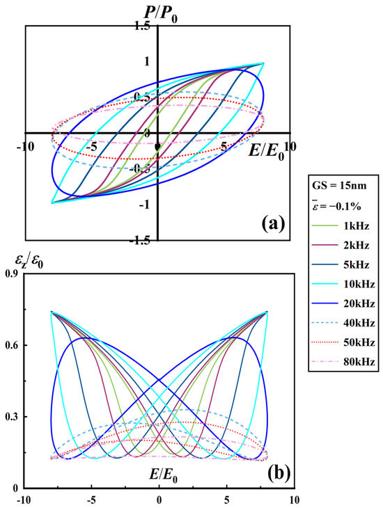 The computation under each preselected frequency is run with sufficient time steps to make sure that a stable response can be observed. The reference values for the electric displacement, the electric field, and the strain constant are established at , and , respectively, with the in-plane strain set as −0.1%. The resulting hysteresis and butterfly loops for each selected frequency are depicted in Figure 2a,b, respectively. It is clear that, at relatively low frequencies, the hysteresis and butterfly loops maintain conventional shapes. However, when the frequency reaches 20 kHz, noticeable changes in both loops begin to occur. Specifically, the hysteresis loop transforms into an elliptical shape starting at 20 kHz, while the butterfly loop evolves into a kidney shape at 40 kHz, subsequently becoming elliptical at 80 kHz. As the frequency increases, the sharp tails of the butterfly loops gradually fade away. Clearly, the frequency-dependent behaviors of polycrystalline BaTiO3 nanofilms can be categorized into two distinct frequency phases: a low frequency from 1 to 20 kHz, and a high frequency from 20 to 80 kHz. Previous studies have documented similar unconventional shapes of hysteresis and butterfly loops at elevated frequencies. Liu et al. [40] experimentally observed that the hysteresis loop shape transitions from a slender rhombic form to an elliptical configuration as the frequency varies from 10−5 to 102 kHz. Moreover, Richman et al. [41] employed the second-order Landau model to numerically simulate the dynamic hysteresis response of ferroelectric systems, revealing that the hysteresis loop also adopts an elliptical shape at a high frequency.