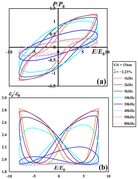 In addition, to investigate the effect of the in-plane strain on the frequency dependence of ferroelectric nanofilms, we also calculated the hysteresis loops and the butterfly loops under an epitaxial strain of −2.23%, as shown in Figure 3a,b. Notably, the center of the hysteresis loop exhibits a concave shape at 1 kHz, and both the remnant polarization and coercive field experience a sudden decrease. Once the frequency is increased to 5 kHz, such a concave shape gradually disappears and returns to an elliptical shape. When the grain size is 15nm, due to the dominant role of dielectric grain boundaries, the film exhibits a significant “two-stage hysteresis” phenomenon under a larger compressive strain (−2.23%). Therefore, at lower frequencies, the in-plane strain has a more significant impact on the ferroelectric properties of thin films. However, as a result of the accelerated polarization reversal at higher frequencies, the ferroelectric response is suppressed, leading to the gradual disappearance of the concave shape of the hysteresis loops.