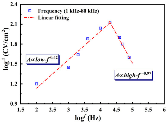 For a quantitative analysis of dynamic hysteresis, we examined the scaling behaviors of BaTiO3 polycrystalline nanofilms. The results, along with the fitting curves, are presented in Figure 5 for the low and high frequency, respectively. The scaling law, represented by the hysteresis area as a function of frequency and field amplitude , is a critical factor in evaluating the key kinetics associated with domain nucleation, growth, and motion. It has been found that the scaling relation between and follows the power law in most systems as: , where the exponents α and β are contingent upon the dimensionality and symmetry of the system [44,45]. In this work, we maintain the amplitude of the electric field at a constant value, thereby allowing for the consideration of the scaling law solely in relation to the frequency, which can be denoted as , where the exponent α is the slope of and . The fitted exponent is in the low-frequency range, while the fitted exponent is in the high-frequency range, as shown in Figure 5. Studies indicate that this frequency-dependent scaling exponent is consistent with the experimental and theoretical results of dynamic scaling behavior in ferroelectric thin film systems observed earlier [44,46].