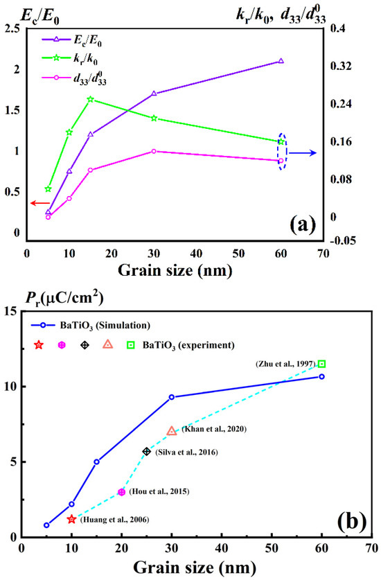 The entire variations in the coercive field , dielectric permittivity and piezoelectric coefficient were plotted in Figure 7 as the average grain size decreased from 60 to 5 nm. The coercive field and piezoelectric coefficient decrease as the grain size decreases, as shown in Figure 7a. However, the dielectric permittivity first displayed a sharp increase and then an abrupt drop, and the peak value was reached at 15 nm. The simulated remnant polarization compared with experimental observations is summarized in Figure 7b. The remnant polarization shows a monotonically decreasing trend as the grain size gradually decreases, which is consistent with the observed experiment in the trend for the corresponding grain sizes in [42,48,49,50,51]. Variations in specific values may arise from differences in selected material parameters and the actual compositions of the tested samples, as the dynamics of polarization switching are highly sensitive to these parameters.