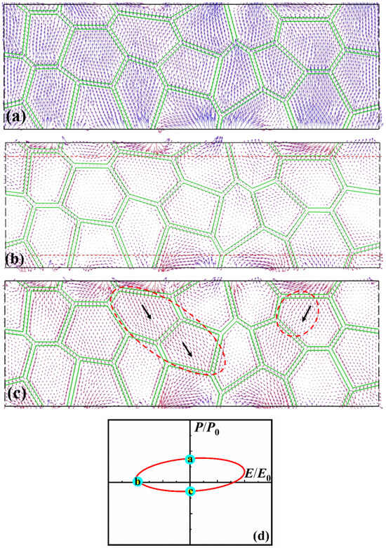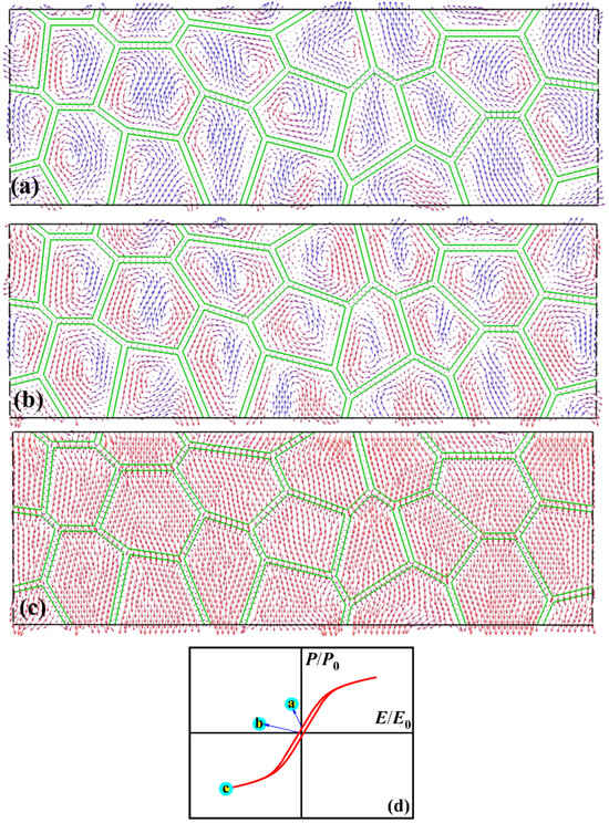 In the remnant state, some grains display vortex domain structures, as illustrated in Figure 8a. Figure 8b shows that the number of these vortex domain structures gradually increases, appearing in nearly all grains. As the electric field rises to its maximum value, these vortex domain structures gradually diminish. At the same time, the polarization vectors point upward, resulting in a single domain structure, as depicted in Figure 8c. The polarization distribution near the grain boundaries is non-uniform, leading to the generation of a strong depolarization field, which inhibits polarization switching and induces the formation of vortex domain structures. However, these vortex structures are more readily reversible compared to mono-domain structures, which contribute to a reduced remnant polarization and coercive field.