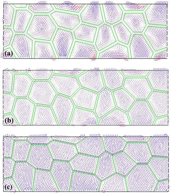 The remnant-state polarization distribution of the polycrystalline nanofilm with the grain sizes being (a) 10 nm; (b) 15 nm; (c) 30 nm.