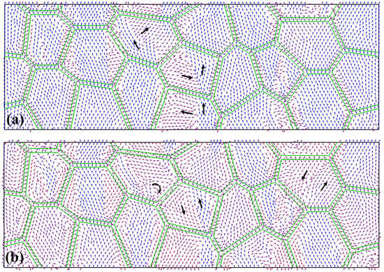 To further reveal the mechanism of domain structure induced by in-plane strains. The distribution of the polycrystalline nanofilm at frequency 5 kHz under in-plane strains −2.23% is displayed in Figure 11. In the remnant-state polarization state, most grains exhibit vertically upward single domain structures, while some grains exhibit 90° domains, as shown in Figure 11a. As the electric field is reverse-loaded to the coercive field state, a complex multi-domain structure (180° domains and vortex domains) appears inside the grain. An excessive compressive strain intensifies the internal interaction forces between the grains and grain boundaries, thus leading to the formation of a complex domain structure. Meanwhile, under a different in-plane strain, the dynamic microstructure of ferroelectric thin films can exhibit diversity while the role of the grain boundaries is also crucial. Therefore, selecting appropriate substrates and electrical parameters can further control the electrical properties of ferroelectric polycrystalline materials by regulating the distribution of micro-domain structures.