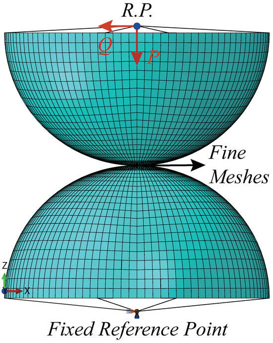 In this study, ABAQUS/Standard [14] is used to track the frictional contact behavior numerically. We first set up an MPC (Multi-Point Constraint) BEAM to constrain the motion of the top and bottom surface region of each half-sphere to the motion of a rigid body reference point. The motion of the bottom reference point is constrained to be fixed, and the motion of the other upper reference point is only allowed to move in three translational directions. The upper reference point is used to apply the external loading to avoid the stress concentration. The following periodic normal and tangential forces are loaded at the upper reference point,