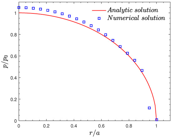 Figure 2. Normalized contact pressure vs. normalized distance for the Hertzian contact without friction: p is contact pressure, p 0 is peak pressure in the center, r is the distance from the center, and a is the contact semi-width.