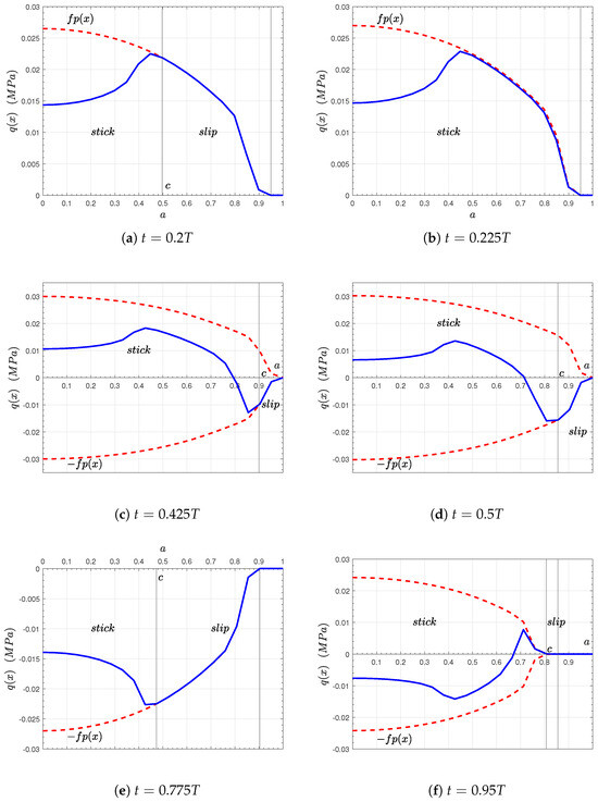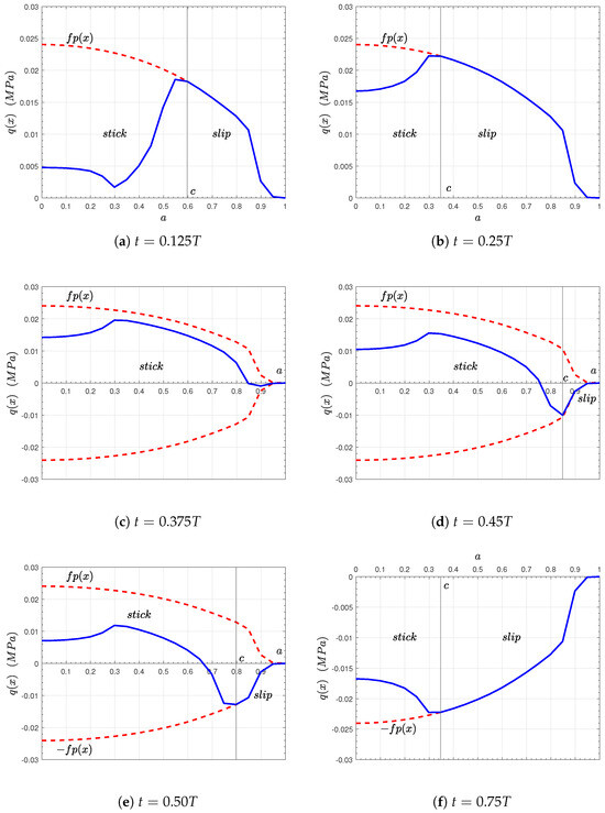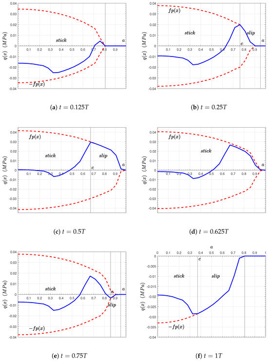 Figure 3. Evolution of semi-contact traction for the numerical solution with P = P 0 , Q ( t ) = Q 1 sin ( w t ) , the coefficient of friction f = 0.35 , and a period T.