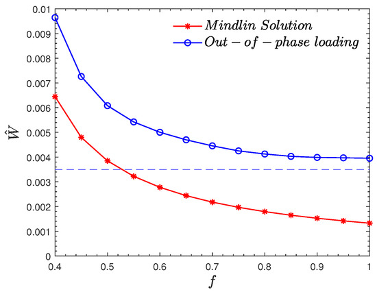 For the three different loadings, the total energy dissipation per cycle as a function of the coefficient of friction f has been compared in Figure 6. In all three cases, a maximum dissipation occurred when we arrived at a state where gross slip (sliding) was possible, and the out-of-phase loading always showed the biggest energy dissipation compared to the other two loadings for all values of f. At a large coefficient of friction, when P and Q both varied, but the loading and unloading curves were identical, energy dissipation did not occur. The numerical solution shows that there is no slip as long as d Q / d P < f . Thus, there is a critical f above which there is no dissipation. This limit value of the coefficient of friction can be determined by finding the maximum slope of the given P, Q curve. For the given loading, the critical coefficient of friction f was 1, so there was no energy dissipation above the critical coefficient f. The Cattaneo–Mindlin-type loading always shows some slip, and the energy dissipation is larger than the in-phase loading. However, the numerical solution shows that energy dissipation asymptotically to zero at large coefficient of friction.
