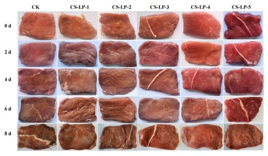 Water holding capacity is a key factor affecting the color, texture, and flavor of meat, and is important for evaluating meat quality. The cooking loss is regarded as an important indicator for evaluating water holding capacity. The cooking loss of beef samples increased gradually as the storage time increased (p < 0.05) (Figure 4). On day 0, the cooking loss of samples with treatment was significantly lower than that of the control group (p < 0.05), except for the CS-LP-5 sample. There was no difference observed among other treatment groups (p < 0.05), except for the CS-LP-5 sample. A similar trend was observed on day 2. On day 4, the CK sample had the highest cooking loss, followed by CS-LP-5, CS-LP-4, and CS-LP-3 samples which did not observe a significant difference (p < 0.05). The CS-LP-1 sample had the lowest cooking loss, followed by the CS-LP-2 sample. On day 6, there were significant differences in cooking loss among different groups of samples, except for the CS-LP-3 and CS-LP-4 samples. The CK sample had the highest cooking loss and the CS-LP-1 sample still had the lowest cooking loss. A similar trend was observed at day 8 and there were significant differences among all groups (p < 0.05). The cooking loss of the samples with treatment was lower than that of the control group since day 0, except for the CS-LP-5 sample.