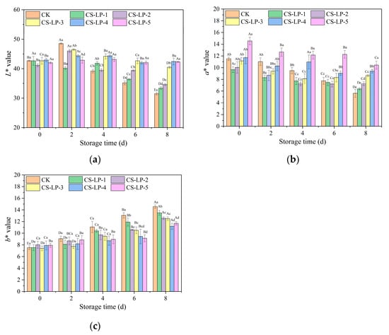 Similar phenomena could also be observed from the color parameters of samples (Figure 2). The most important color traits of fresh meat at the time of sale are the lightness (paleness) measured by CIE-L*; the redness measured by CIE-a*, and the yellowness measured by CIE-b*. It was observed that the L* value of the CK sample was first increased from 42.70 to 48.54 and then decreased to 31.50. Other treatment groups exhibited a similar change pattern with the increasing number of storage days, except for the CS-LP-1 sample. The L* value of the CS-LP-1 sample continuously decreased with the extension of storage time. As the proportions of lycopene in the soaking solution gradually increased, the amplitude of the change in the L* values of the samples gradually decreased. The L* value of the CS-LP-5 sample did not change significantly throughout the entire storage period.