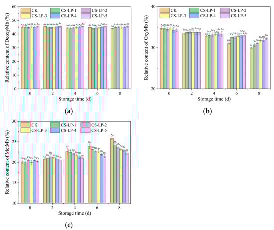 The relative content of different Mb forms during storage. (a) DeoxyMb. (b) OxyMb. (c) MetMb. Different letters (a, b, c, d) indicate significant differences between the samples with different treatments at the same time (p < 0.05). Different letters (A, B, C, D, E) indicate significant differences between different storage days for the same sample (p < 0.05).