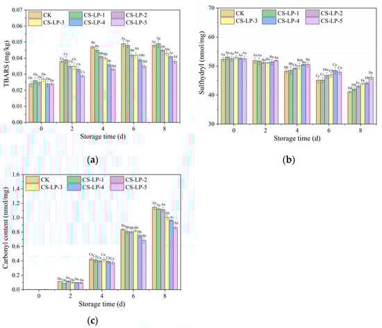 Meanwhile, it was observed that the sulfhydryl content of the samples decreased and the carbonyl content of the samples increased during storage. The sulfhydryl content of the CK sample decreased from 52.25 to 41.13 nmol/mg while the sulfhydryl content of the CS-LP-5 sample decreased from 52.55 to 46.18 nmol/mg. The carbonyl content of the CK sample increased from 0.002 to 1.146 nmol/mg while the carbonyl content of the CS-LP-5 sample increased from 0.002 to 0.865 nmol/mg. On day 8, there were significant differences in sulfhydryl content among different treatments of samples, except for CK and CS-LP-1 samples. Similarly, there were significant differences in carbonyl content among different treatments of samples, except for CK, CS-LP-1, and CS-LP-2 samples. The sulfhydryl content of the CS-LP-5 sample was the highest since day 4 and the carbonyl content of the CS-LP-5 sample was the lowest since day 6.