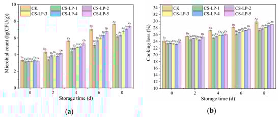 Microbial count and cooking loss of the beef samples during storage. (a) Microbial count. (b) Cooking loss. Different letters (a, b, c, d, e, f) indicate significant differences between the samples with different treatments at the same time (p < 0.05). Different letters (A, B, C, D, E) indicate significant differences between different storage days for the same sample (p < 0.05).