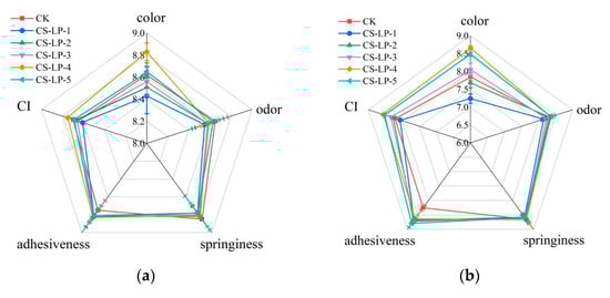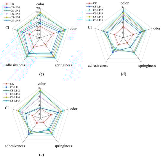 In order to comprehensively assess the quality of beef samples, sensory evaluation was organized. The sensory evaluation scores of all samples decreased as the storage time increased (Figure 6). On day 0, the CS-LP-4 sample had the highest color score. The reason was that soaking had a negative impact on the color of beef, but the staining effect of lycopene could make the beef appear redder. However, overly high lycopene concentration resulted in overly red color, which led to lower acceptance by consumers. It was observed in Figure 1 that the color of the CS-LP-5 sample treated with the highest concentration of lycopene was too red and appeared unnatural. The overall CI value of the CS-LP-4 sample was higher than that of other samples. On day 2, the CS-LP-4 sample had the highest color score, followed by the CS-LP-5. The CS-LP-1 sample had the lowest color score. The CK sample had the lowest adhesiveness score. The overall CI values of the CS-LP-4 sample and the CS-LP-5 sample were higher than that of other samples. On day 4, the CK sample had the lowest color, odor, springiness, and adhesiveness score. Therefore, the CK sample had the lowest CI value. The CI values of the CS-LP-4 sample and the CS-LP-5 sample were higher than those of other samples. A similar trend was observed on day 6. On day 8, the CS-LP-4 sample had the highest CI value, followed by CS-LP-5. In summary, the CS-LP-4 and CS-LP-5 samples had higher CI values than other groups of samples throughout the entire storage period. On day 8, compared to CK, the CI value of the CS-LP-4 sample increased by 116.27% and the CI value of the CS-LP-5 sample increased by 105.42%. It was suggested that when the ratio of chitosan to lycopene was 1:3, the beef had the best quality and storage stability.