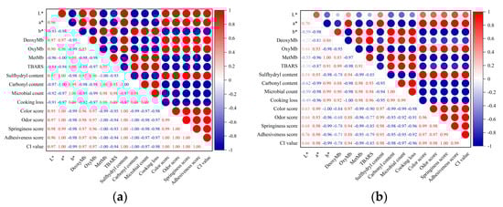 Correlation analysis of color parameters (L*, a*, b*), the contents of three different forms of Mb (DeoxyMb, OxyMb, MetMb), lipid oxidation (TBARS), protein oxidation (sulfhydryl content, carbonyl content), microbial count, cooking loss and sensory evaluation score (color score, odor score, springiness score, adhesiveness score, CI value) was conducted. The correlation analysis results of different indicators in the storage of the CK sample are shown in Figure 7. The results showed that the DeoxyMb content of the CK sample was significantly positively related to the L* value, a* value, odor score, springiness score, adhesiveness score, and CI value (p < 0.01) and was positively related to color score (p < 0.05). Still, it was negatively related to b* value (p < 0.05). However, the DeoxyMb content of the CS-LP-4 sample was uncorrelated to the L* value, a* value, b* value, and all sensory evaluation scores. The OxyMb content of the CK sample was positively related to the L* value (p < 0.05). It was significantly positively related to the a* value and all sensory evaluation scores, but it was significantly negatively related to the b* value (p < 0.01). However, the OxyMb content of the CS-LP-4 sample was positively related to a* value, odor score, springiness score, adhesiveness score, and CI value (p < 0.05), and it was significantly positively related to color score (p < 0.01), but it was significantly negatively related to b* value (p < 0.01). It was uncorrelated to L* value. The MetMb content of the CK sample was significantly positively related to the b* value (p < 0.01) but was significantly negatively related to the L* value, a* value, and all sensory evaluation scores (p < 0.01). However, the MetMb content of the CS-LP-4 sample was significantly positively related to the b* value (p < 0.01), while it was significantly negatively related to the a* value, color score, odor score, springiness score, and CI value (p < 0.01). It was negatively related to adhesiveness score and uncorrelated to L* value. The TBARS of the CK sample was significantly positively related to the b* value (p < 0.01), but it was negatively related to the a* value and all sensory evaluation scores (p < 0.01). It was uncorrelated to the L* value. However, the TBARS content of the CS-LP-4 sample was positively related to the b* value (p < 0.01), while it was negatively related to color score (p < 0.01). It was uncorrelated to the L* value, a* value, odor score, springiness score, adhesiveness score, and CI value. The correlation between sulfhydryl content of CK sample and color parameters, sulfhydryl content and sensory evaluation score was similar to that of CS-LP-4. The carbonyl content, microbial count, and cooking loss behaved similarly to sulfhydryl content.