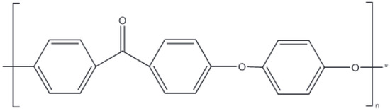 Thanks to PEEK’s high glass transition temperature (143 °C) and melting temperature (343 °C), PEEK can still maintain excellent physical properties at extreme temperatures [5]. PEEK exhibits excellent electrical insulation and dielectric properties under different temperatures and harsh environments, especially maintaining a low dielectric constant and loss factor at high temperature and under humid conditions [6,7]. In addition, PEEK has good biocompatibility and is widely used in medical implants because it does not cause rejection or toxic reactions [8,9].