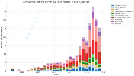 Figure 2 shows the annual publication of papers on PEEK-related topics. Since 2000, the number of papers published on PEEK-related topics has generally shown a significant growth trend, especially after 2015, which shows that research in this field has gradually received more attention. Among the subjects discussed, chemical modification has been the main research direction. From 2010–2020, research on various topics in this stage increased significantly, especially regarding plasma spraying, chemical modification, and aerospace. The growth during this period may be due to the gradual recognition of PEEK’s characteristics in industrial applications. After 2020, the number of publications in this stage reached a peak, especially in the fields of automotive and aerospace applications, and the application of PEEK has been more widely explored and studied in these industries.