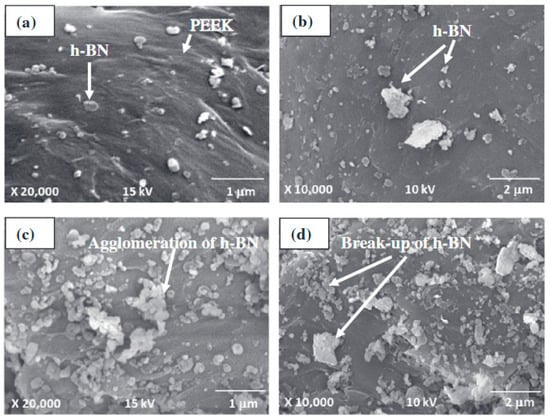 SEM images of h-BN/PEEK composites: (a) 2 wt.% h-BN, particle size of 0.1 μm, (b) 2 wt.% h-BN, particle size of 1.5 μm, (c) 8 wt.% h-BN, particle size of 0.1 μm, and (d) 8 wt.% h-BN, particle size of 1.5 μm [16].