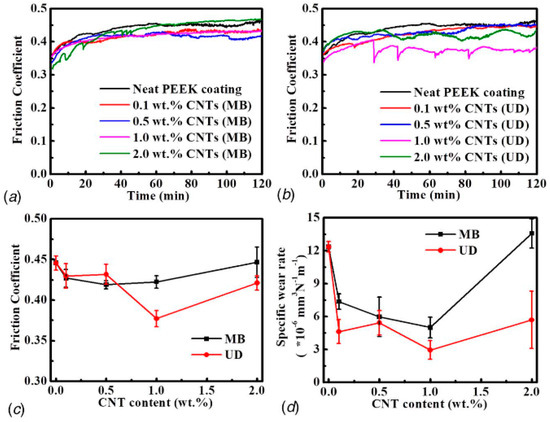 Friction coefficient and specific wear rate of flame-sprayed neat PEEK coatings and flame-sprayed CNT/PEEK nanocomposite composite coatings using MB and UD powders with different CNT contents [18]. (a,b) show the friction coefficient curves of flame-sprayed neat PEEK coatings and flame-sprayed CNTs/PEEK nanocomposite composite coatings using MB and UD powders with different CNT contents during the sliding time of 120 min. (c,d) show the friction coefficient and the specific wear rate of flame-sprayed neat PEEK coatings and flame-sprayed CNTs/PEEK nanocomposite composite coatings using MB and UD powders with different CNT contents.