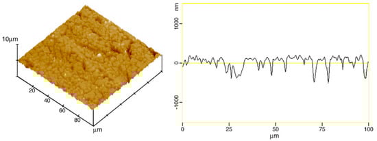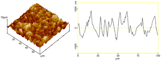 Krishal et al. [21] used high-velocity oxygen–fuel (HVOF) and auxiliary combustion high-velocity air–fuel (AC-HVAF) thermal spraying technology to prepare PEEK coating. The PEEK powder size was selected as 45 μm, the spray gun nozzle length parameters were 150 mm, the spraying distance was 280 mm, and the lateral speed was 300 mm/s. The influence of PEEK coating quality and performance on ANSI304 stainless-steel substrates with different surface roughness was studied. The stainless-steel substrate was subjected to degreasing, etching, and steel grit blasting surface treatments. The surface roughness of the substrate was found to have a significant impact on the properties of the PEEK coating. Higher surface roughness helps to improve the adhesion of the coating, but appropriately increasing the roughness can improve the adhesion. However, the surface treatment increases the process difficulty and may lead to more pores and unevenness on the coating surface, affecting the overall performance of the coating. The surface profile is shown in Figure 7 and Figure 8.