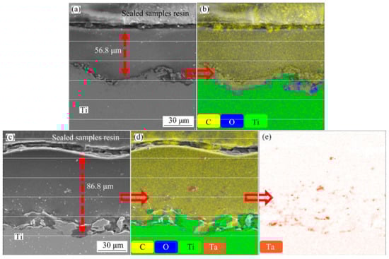 Cao et al. [23] introduced tantalum nitride (TaN) nanoparticles into PEEK coatings by electrophoretic deposition. PEEK powder with a particle size of 25 μm and TaN powder with a particle size of 260 nm were selected as raw materials for preparing composite coatings. The suspension consisted of 100 mL of electrophoretic deposition solution (50 mL of ethanol and 50 mL of chitosan solution (containing 5 mL of acetic acid and 0.1 wt.% chitosan)). Chitosan was used as a dispersant to modify the surface potential of PEEK and TaN particles. These particles were modified to be positively charged and improve the deposition efficiency. Finally, the solution was mixed with different mass fractions of TaN nanoparticles (0, 1.31, 3.23, and 6.25 wt.%) and stirred until fully mixed into four electrolytes. A Pt sheet was used as the anode and the titanium substrate was used as the cathode. The distance between the cathode and the anode was fixed at 1 cm, and electrophoresis was performed at 15~25 V for 30~180 s. It was found that the introduction of TaN nanoparticles into PEEK coatings improved deposition efficiency, enhanced deformation resistance, and improved the hardness, elastic modulus, and bonding strength of the coatings. Compared with pure PEEK coatings, the friction coefficient of P-TN-3 was greatly reduced by 31.25%. The wear resistance of P-TN-3 was also greatly improved, and its specific wear rate was reduced from 9.42 × 10−5 to 1.62 × 10−5 mm3·N−1·m−1. The uniform composite TaN/PEEK coating prepared by electrophoretic deposition adhered well to the titanium alloy substrate. The cross-sectional SEM images of the coatings (Figure 9a,c) showed that under the same deposition conditions, the coating thickness was increased from 56.8 μm to 86.8 μm by introducing TaN nanoparticles, and the Ta element’s distribution in the coatings was relatively uniform (Figure 9c–e). Both PEEK and P-TN-3 coatings were well bonded to the titanium substrate. Heat treatment resulted in a uniform and dense coating. The coating was well bonded to the substrate, and no obvious cracks were found at the interface.