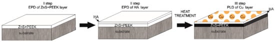 Scheme of particular stages of multilayer Cu/HA/ZnS+PEEK coating fabrication [24].