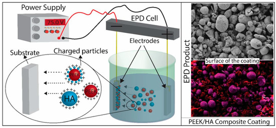 Similarly, Fatih E et al. [26] also analyzed suspension composition and process parameters and prepared a PEEK-HA composite coating on a titanium substrate using electrophoretic deposition. HA was 4 wt.% in the optimal ratio, and 75 V was the optimal voltage. It was found that the addition of HA significantly improved the biocompatibility of the coating while maintaining the excellent mechanical properties of PEEK. The schematic diagram of EPD and deposition mechanism of PEEK-HA composite coating is shown in Figure 11.