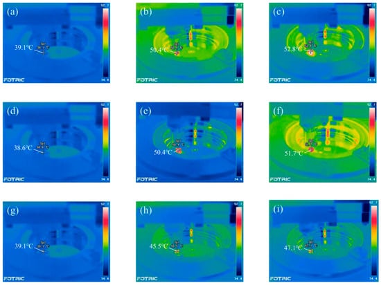Infrared thermal image of peek and surface friction of composite materials at 0 min, 40 min, 80 min: (a–c) PEEK, (d–f) +20P (g–i) +20P/4B/2Si [38].