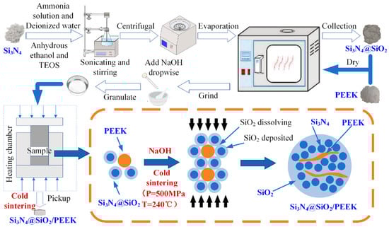 Gu et al. [39] used a cold sintering process to prepare a silicon nitride (Si3N4)@SiO2/PEEK core–shell composite material with a SiO2 shell layer. The preparation process of the Si3N4@SiO2/PEEK composite material is shown in Figure 13. It was found that with the increase in the SiO2 shell thickness, the density of the composite material continued to increase, and the hardness first increased and then did not change much. The friction coefficient and wear rate of the Si3N4@SiO2/PEEK composite material with a SiO2 shell thickness of 50 nm were reduced by 15% and 80%, respectively, compared with the friction coefficient and wear rate of the SiO2 shell thickness of 12.5 nm.