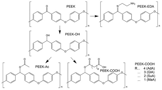 Synthetic routes to endow PEEK surfaces with aliphatic functionalization (PEEK-Ac) and carboxylic end groups (PEEK-COOH) or primary amino groups (PEEK–EDA) [43].