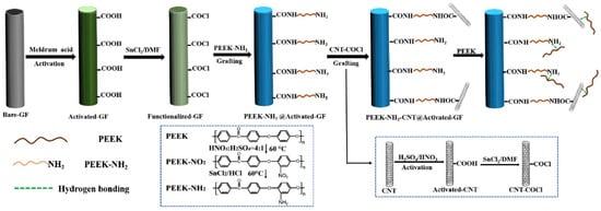 Zhu et al. [44] addressed the problem of relatively weak interfacial strength between glass fiber (GF) and the polyetheretherketone (PEEK) matrix. By introducing dual compatibilizers of aminated PEEK and acylated carbon nanotubes (CNTs), they established an effective method to enhance the interfacial interaction between GF and the PEEK matrix. The preparation scheme is shown in Figure 15. This method helps to enhance the compatibility, multiple interactions, and mechanical interlocking between the fiber and the matrix. It was found that the interlaminar shear strength (ILSS), tensile strength, and modulus of the modified GF/PEEK composite material were significantly improved by 75% (~35 MPa), 23% (~338 MPa), and 12% (~18 GPa), respectively.