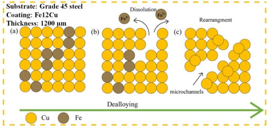 The dealloying mechanism in the Cu-Fe coating [42]. (a) Cu-Fe coating original model. (b) Fe2+ dissolution. (c) Atomic structure rearrangement.