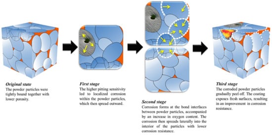 Additionally, the periodic release of copper ions, combined with the exposure of new surfaces during wear, ensured long-term antifouling performance. Figure 4 illustrates the dynamic evolution of the coating during use. In the first stage, physical wear and corrosion from contact with the marine environment caused localized degradation, exposing new surfaces. In the second stage, these newly exposed surfaces released the embedded copper components into the environment, maintaining the antifouling effect. The third stage involves a self-repair and re-release cycle, where the excellent wear resistance and adhesion of the 304L-Cu SS coating allow degraded areas to partially repair themselves, initiating a new antifouling cycle. This cyclical process ensures that the coating maintains stable antifouling performance over long-term use.